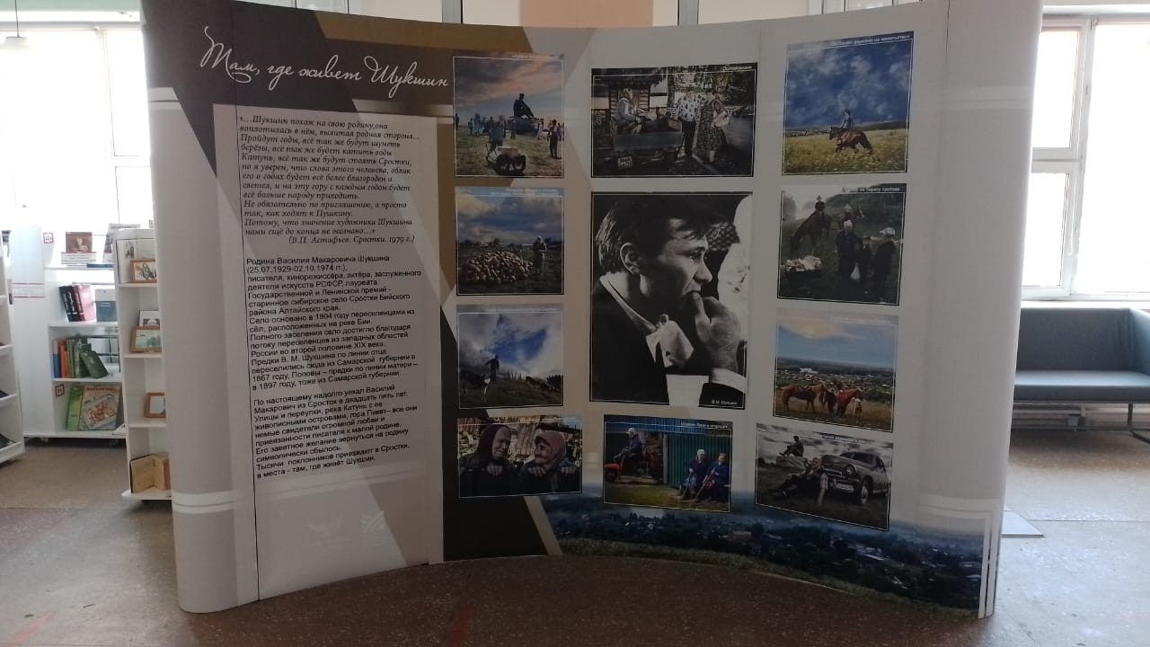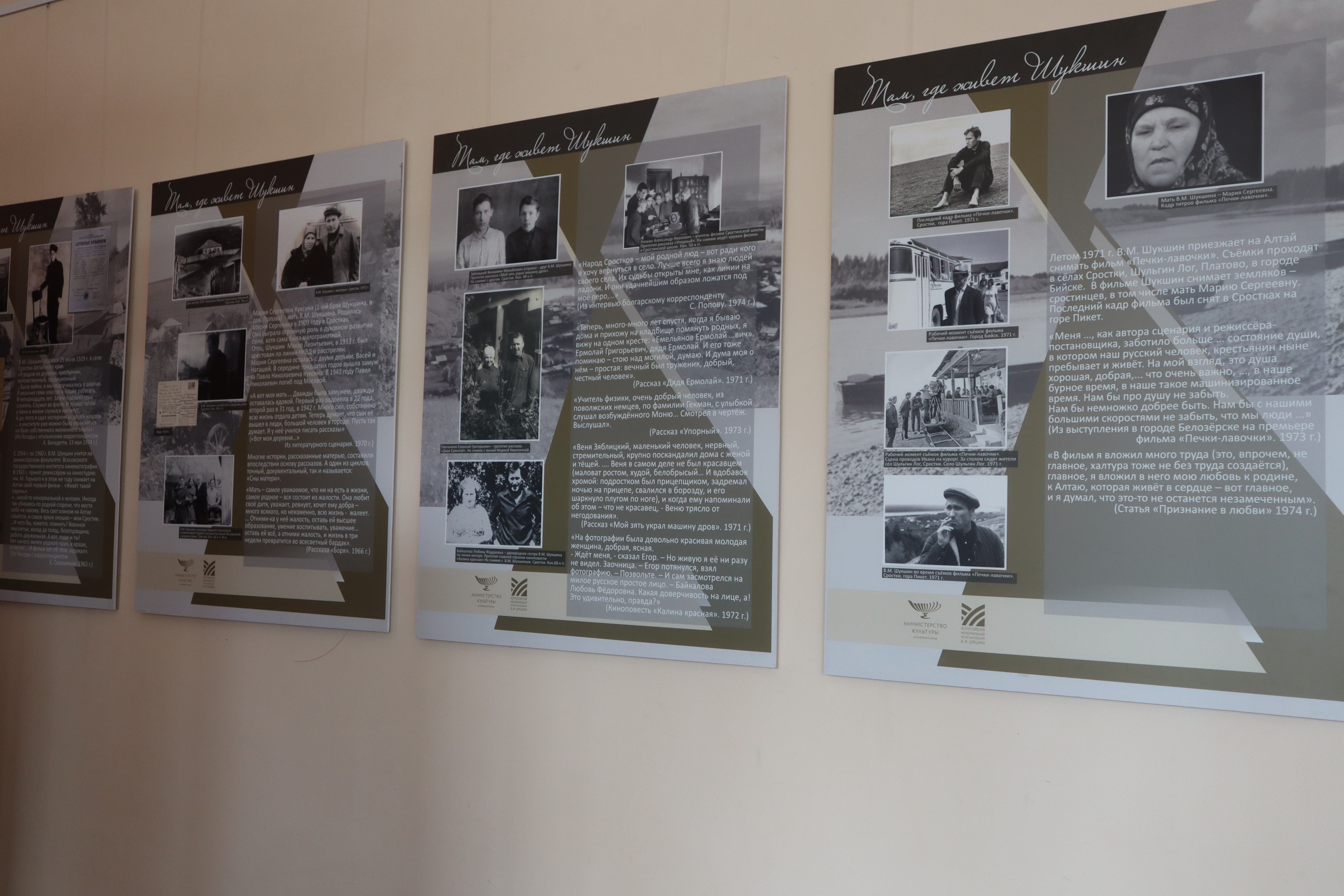 В экспозиции представлены фотографии детства и юности В. М. Шукшина, кадры фильмов, снятых режиссёром Шукшиным на Алтае, фотографии земляков - прототипов героев его произведений. Также представлена история создания музея-заповедника в Сростках.